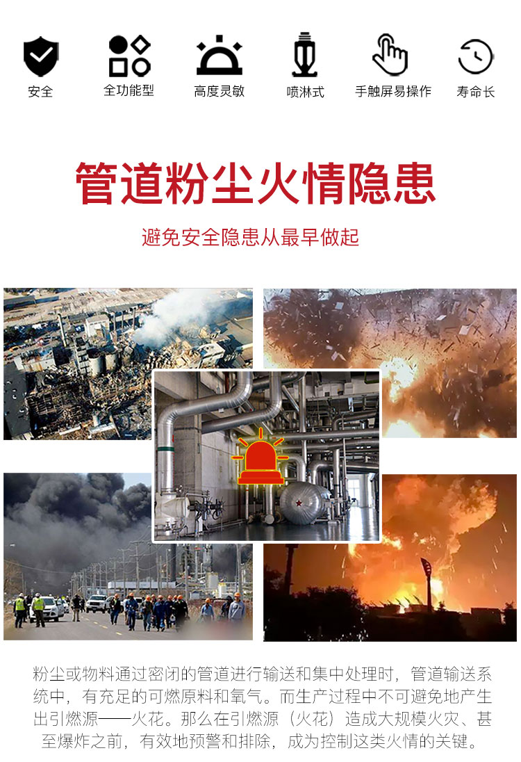 1 采用先进 ARM芯片,火花响应速度在纳秒(ns)级别。软件采 EeOS实时操作系统,零死机风险,确保火花即刻反应。系统具备多任务的处理能力,为监控和处理每个区域的火灾隐情提供了并发的技术保障,同时节约您的投资成本、br/>2 熄灭作业自动终止。系统一旦探测不到火花,就自动停止熄灭作业;生产线可以继续运行,不需要停止,也无须人工干预,**程度地提高了生产效率;这种特殊功能正是该系统区别于一般安防系统的地方、br/>3 高品质人机交互体验;8寸超大液晶显示屏,LED背光;图形化操作界面,简单易用;表面强化电阻触摸屏,精准、耐脏、耐磨、br/>4 详细的事件记录。可存储多达 2000条的数据,不但为事后分析提供了可靠的依据,更为今后更好的生产提供了有效的参考。详细记录了火花发现的时间、地点、数量、持续时间,熄灭作业的开始时间、停止时间、作业地点,系统周期性自检的结果,各个子系统的运行状况。所有这些记录掉电依然可以保存,不会丢失您的任何信息、br/>5 完善可靠的自检系统。在检测管道内火灾隐患的同时,不断地定期检测所有模块的健康状况,保证整套系统的良好运行;如发现损坏、断线、水压不足、漏水、系统断电等故障,可快速告警,通知用户、br/>6 可配置的联动措施。系统配有继电器,用户可以根据实际需求配置联动继电器输出;继电器可以配合用户的除尘设备或生产线,采取进一步措施、br/>7 可选配的后备电源模块。该模块附带一蓄电池,可以在外接电源停电或意外断电的情况下满负荷工 24小时,确保系统不间断地保障您的生产安全、br/>8 每个输出点均有保险丝,确保无短路风险。我们在每个保险丝槽内附带备用保险丝,贴心备用。在发生短路后,可立刻换上备用保险丝、br/> 探头的技术优炸br/> 火花探头安装在输送管道壁上,有效地捕捉管道中火花发出的红外线。即使火花隐藏在稠密的物料中,探头也能灵敏地探测到、br/>1 探测灵敏。在研究各类火花的特征光谱曲线的基础上,选择对应的高速光敏原件,匹配探测波长范围。探头能够探测到*小的火花和炽热颗粒,具有高度的灵敏性;同时,探测系统能够穿过高密度的物料、尘埃进行探测、br/>2 采用光电检测技术。非接触检测,不对被检测对象有任何的干扰,不会影响正常的生产流程;同时具备灵敏度高、稳定性好、功耗低、寿命长等优点,适合工业级的不间断工作、br/>3 广角探测设计,仅用两个探头就能完全覆盖管道、br/>4 外壳坚固。探头外壳采用航空铝材料和不锈钢,轻巧坚固,耐氧化、耐腐蚀。配合专门设计的防水槽和密封圈,使得外壳整体达到 IP67防护等级,可用于户外的严苛环境。醒目的外层黄色涂装,使您一看便知探测点的所在、br/>5 安装快速。探头安装采用专门的连接件,使得安装非常容易,一个人仅需数分钟就能完成一个探头的安装、/p>