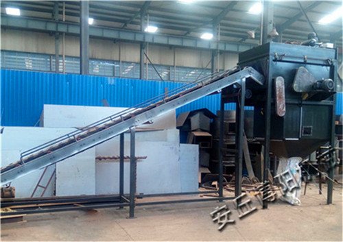 袋装粉粒体物料由皮带输送机传送至45度角的滑板上并依靠重力沿滑板下滑,在下滑过程中由快速转动的铁片将包装袋割开,被割开的残袋和物料滑入滚筒筛进行筛分。从滚筒筛落下的物料由螺旋输送机输出,破损的包装袋、杂质、结块物料被滚筒筛带出机体。割片破袋过程中引起的粉尘由布袋式除尘器捕获并抖落入螺旋输送机(由螺旋输送机输出的物料可通过我公司的管链输送机或者气力输送装置,输送至至物料储罐中)、/span>