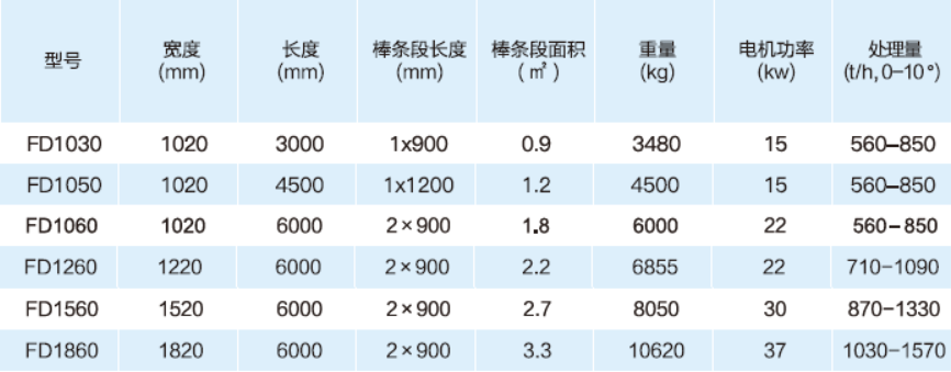 - 棒条段为?双阶结构,棒条间距可调,弹簧座采用销轴安装,给料机可?-10°倾角安装、br/>技术参数: