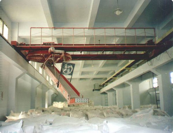 成品包经板式输送机从打包间输送到成品库,并送至桥式码包机的大行车上输送带,桥式码垛机的大行车沿成品库的纵向行走,小行车沿库房的横跨方向移动,在大 行车上输送机以及配套的转弯机构的作用下成品包流经?70°自由回转的悬挂式回转盘(非回转型无此结构)和可随垛位的高低电动升降的滑槽?终完成在?nbsp;房的各点连续堆垛。同时亦可用于成品包在库内直接装车、/td> | ||||