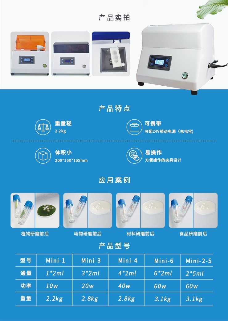 实验室场地太小,高通量组织研磨仪太贵,带出去实验太麻烦,这些烦恼统统不用担心,我司新款的Mini便携式将这些问题统统解决、/p>