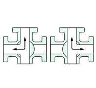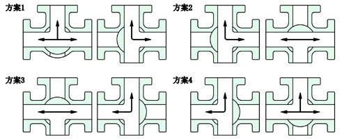 气动三通球阀分L型和T型,介质流通方向见下图。L型气动三通球阀适用于介质流向的切换,能使相互垂直的两个通道连通:T型气动三通球阀适用于介质的分流、合流或流向 切换,T型孔道可以使三个通道互相连通或使其中两个通道连通,气动三通球阀一般采用三个阀座结构,亦可根据用户要求采用四阀座结构、/p>
