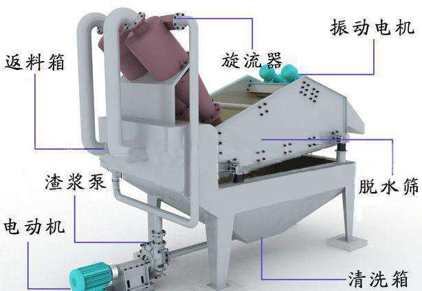 泥沙分离器是细沙回收机工作的核心部件,真空高压泵在整个设备中起到了至关重要的作用。洗槽内的砂水混合物在真空高压泵的作用下,被高速输送至泥沙分离器;细砂在泥沙分离器内经过离心、分级、浓缩,从沉砂嘴排出;经脱水筛脱水后,实现泥沙分离效果;分离后的泥水及少量细砂,从泥沙分离器上部的溢流口经返料装置回 清洗槽,实现了细砂的循环回收及水资源的重复利用,达到了节能的效果。当清洗槽内泥土含量过高时,向清洗槽内加入的泥沙混合物及水,使液面升高,从出水口排出、/span>