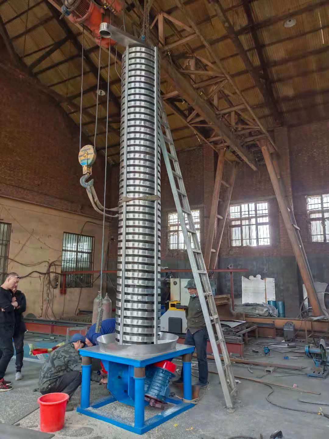 该设备的驱动装置,即振动电机安装在输送塔下部,两台振动电机对称交叉安装,输送塔由管体和焊接在管体周围的螺旋输送槽组成,输送塔座于减振装置上,减振装置由底座和隔振弹簧组成。当垂直输送机工作时,根据双振动电机自同步原理,由振动电机产生激振力,强迫整个输送塔体作水平圆运动和向上垂直运动的空间复合振动,螺旋槽内的物料则受输送槽的作用,作匀速抛掷圆运动,沿输送槽体向上运动,从而完成物料的向上输送作业、/span>
