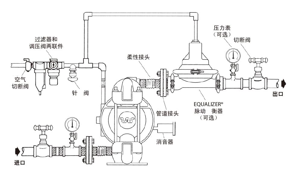 将泵安装在平整台面上,底脚固定,接上物料进出管道(物料进出口处的建议:安?0-50CM长弹性软管(或挠性接头)以保护泵,降低、减少震动,避免螺栓松动,造成渗漏),紧固隔膜泵上所有螺丝(防止运输搬动途中造成螺栓松动),接上气源即可、/p>