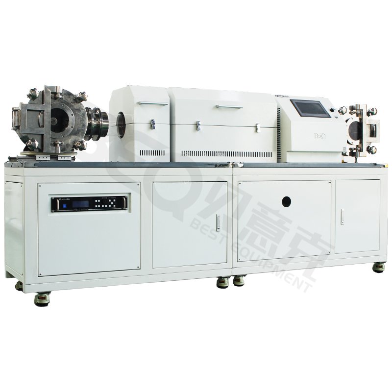 该设备为我司研发用于材料连续生长的专用设备,此款设备是快速冷却卷对卷等离子体增强CVD连续生长炉,它由高温生长腔体,质量流量计气路系统,真空机组,RF射频电源模块,石英管,冷却装置,收放卷的密封装置,自动化控制系统组成,两端分别安装有进料进气真空腔室和出料排气真空腔室(即收放卷的密封装置),收放密封装置内分别对应安装有放卷滚轮和收卷滚轮,所输出料排气腔体与炉体之间安装有冷却装置。相对于现有技术具有快速冷却、连续生长的优点、/span>