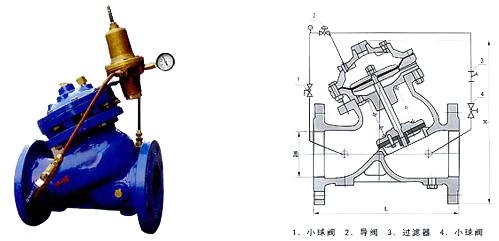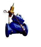 当管道从进水端给水时,水流过针阀进入主阀控制室,出口压力通过导管作用到导阀上,当出口压力高于导阀设定值时,导阀关闭,控制室停止排水,此时主阀控制室内压力升高并关闭主阀,出口压力不再升高、br/> 当出口压力降到导阀设定压力时导阀开启,控制室向下游排水。由于导阀的排水量大于针阀的进水量,主阀控制室压力下降,进口压力使主阀开启。稳定状态下,控制室进水、排水相同,开度不变,出口压力不变、br/>调节导阀弹簧即可设定出口压力、br/>工作特点