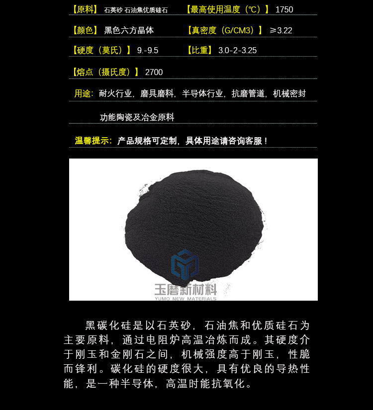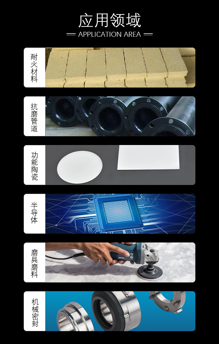 碳化硅由于化学性能稳定、导热系数高、热膨胀系数小、耐磨性能好,除作磨料用外,还有很多其他用途,例如:以特殊工艺把碳化硅粉末涂布于水轮机叶轮或汽缸体的内壁,可提高其耐磨性而延长使用寿??倍;用以制成的高级耐火材料,耐热震、体积小、重量轻而强度高,节能效果好。低品级碳化硅(含SiC?5%)是极好的脱氧剂,用它可加快炼钢速度,并便于控制化学成分,提高钢的质量。此外,碳化硅还大量用于制作电热元件硅碳棒、/p>