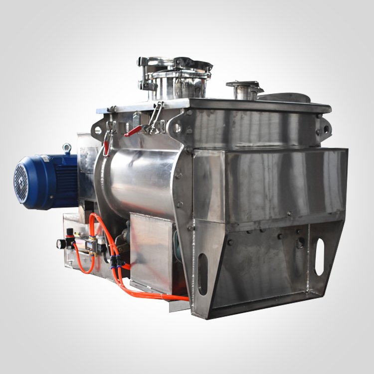 卧式双轴桨叶混合机由卧式W形容器、带(或者不带)开口的顶盖、安装有桨叶并反向旋转的双轴、传动单元、支撑架、密封件、出料结构等部件组成。由于双轴反向旋转,成一定角度的浆叶将物料沿轴向、径向循环翻搅,使物料达到均匀混合的效果。物料在混合器内的上抛运动形成流动层,产生瞬间失重,所以此系列混合机也叫做无重力混合机、/span>