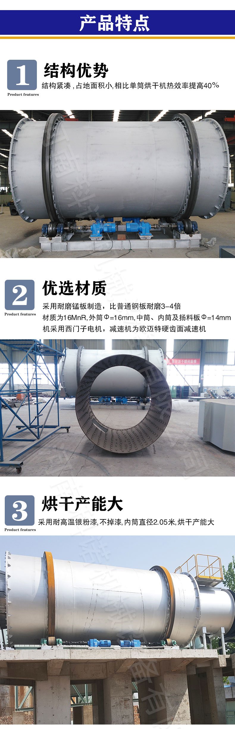 三筒烘干机又叫做三回程烘干机,物料的流动是靠筒内叶片随筒体转动拨动前进的,三回程烘干机是由三个同心的直径不同的圆筒嵌套在一起的,这种特姝的结构形式决定其产量的大小,所以这种新型烘干机就叫三回程烘干机。这种烘干机具有结构紧凑,占地面积少,是相同产量单筒烘干占地面积的二分之一,工作可靠,能耗低,热效率高,物料烘干效果好,容易实现自动化控制,操作人员少、br/>