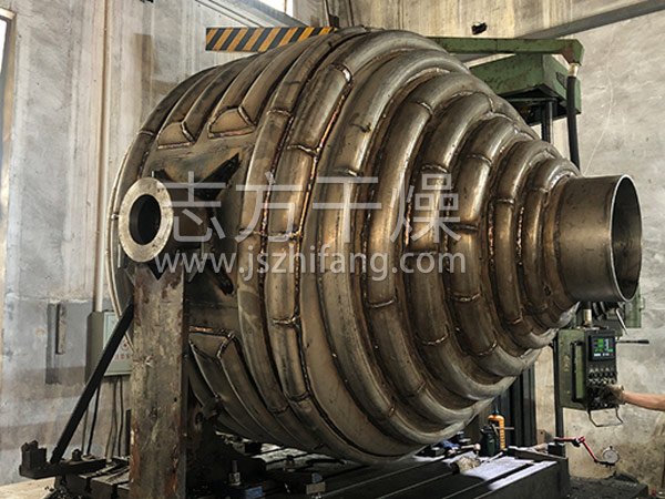 目前干燥机械行业制造双锥回转干燥机时普遍使用夹套加热装置。但是其具有受热不均匀的缺点,加热介质难以进入部分夹套死角区域,影响产品质量和产量。加热介质容易在夹套内结垢。加热介质会因重力问题产生加热偏向并引起热利用率低的问题。另外夹套加热装置属于压力容器,对使用场所和后期维护会有所限制。夹套加热装置由铁板与不锈钢板焊接而成,材料膨胀系数不同,长时间使用有容易渗漏的缺点、/p>