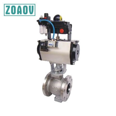 V型球闽采用金属硬密封结构,V型闽芯及金属闽座在回转过程中,球芯的V型缺口与阀座做比例流量调节,并且密封面紧密配合,V型口具有强大切断介质、杂质的功能,避免阀门卡死现象发生,并具有自洁功能,配合气动执行器,可以实现90°范围的启闭,跟定位器配套实用可实现远程微电脑控制阀门流量开度,可实现比例调芁与二位五通电磁及控制箱配套实用,可实现开关控制、/p>