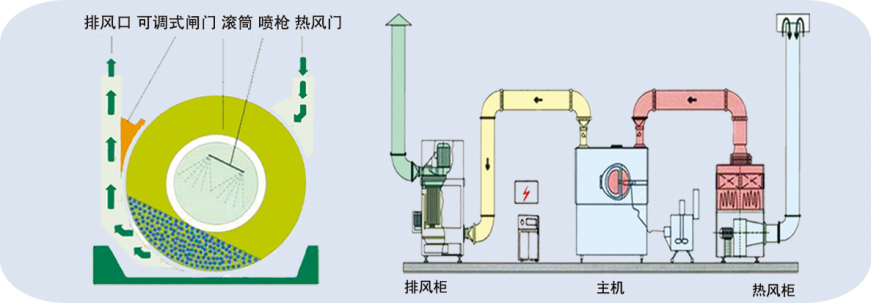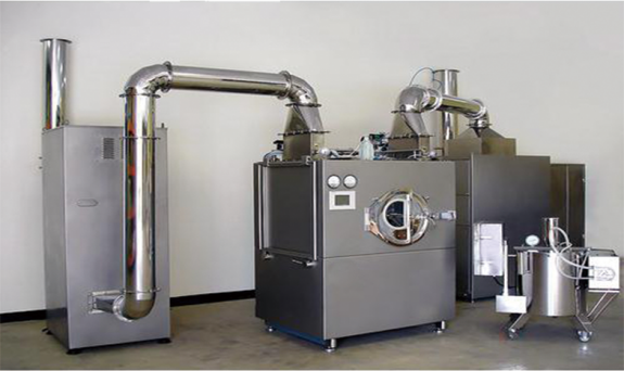在包衣滚筒回转作用下,素芯在滚筒内连续运动。蠕动泵将包衣介质输送到喷枪喷覆在素芯表面,在负压条件下,进风空气处理单元按设定的程序和工艺参数向片床内供给洁净的热风,对素芯进行干燥;热风通过素芯层底部经排风空气处理单元排出,使喷覆在素芯表面的包衣介质快速形成坚固、细密、光整、圆滑的表面薄膜,完成包衣、/p>