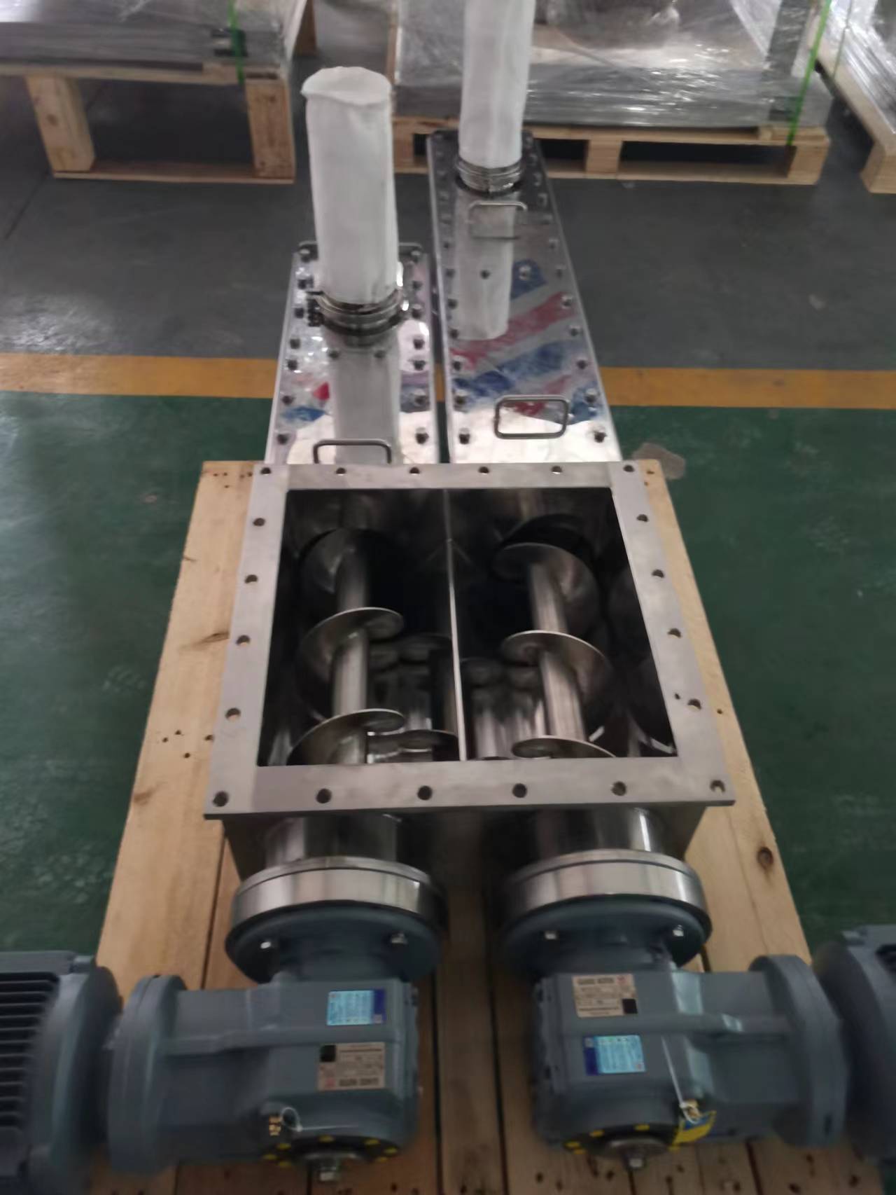 双螺旋给料机是由两个螺杆组成,主要用于物料在运动到目的地时需要混合的情况