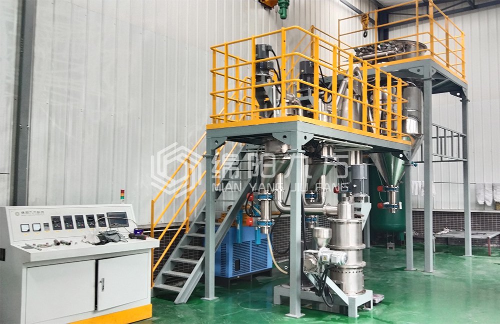 物料由加料系统均匀的送入粉碎室,受到高速旋转的粉碎盘的强烈冲击,同时受到离心力的作用,与粉碎齿圈发生碰撞,受到剪切、摩擦、碰撞等多种综合力的作用,使物料粉碎,被粉碎的物料随气流运动到分级区,通过变频调节的分级轮,对粗细物料进行分离,符合细度要求的产品随气流进入旋风收集器和除尘器收集,粗颗粒返回粉碎区继续粉碎、/span>