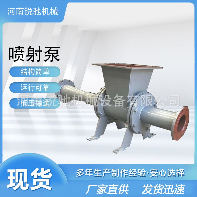 物料从锁气器均匀、恒量的进入喷射输送泵腔室,经流化箱一次流态化后,具有向喷咀流动的趋势,在喷咀与内文丘里管之间形成负压区,将流态化的物料卷入混合管内,再经扩散管段减速增压,使物料输送至目的地