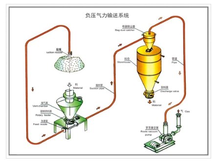 负压气力输送生产线一般有接料器、输料管道、卸料器、除尘器、风机气源设备等组成,气源设备放在系统末端,物料的输送过程是在风机吸气段一侧完成、br/>1)环境清洁:输送装置处于负压状态下工作,物料和灰尘不会飞逸外扬;
