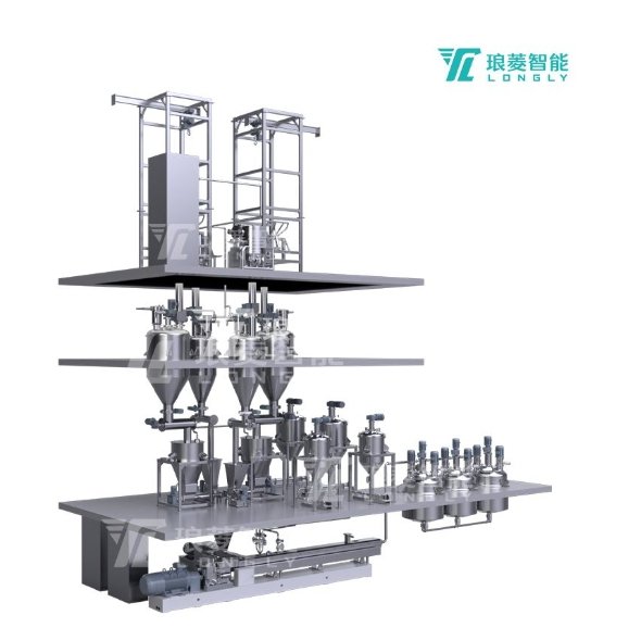 ①吨包解包站 ②小包解包站 ③旋转除铁器 ④电子称重料 ⑤螺旋送料 ⑥粉体失重计量喂料机 ⑦汇聚落料斗 ⑧液料失重计量喂料机 ⑨双螺杆粉料混合 ⑩双螺杆连续匀浆机 ⑪浆料搅拌暂存罐