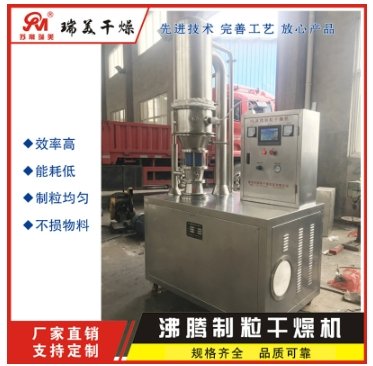 物料粉末粒子,在原料容器(流化?中呈环形流化状态,受到经过净化后的加热空气预热和混合,将粘合剂溶液雾化喷入,使若干粒子聚集成含有粘合剂的团粒,由于热空气对物料的不断干燥,使团粒中水份蒸发,粘合剂凝固,此过程不断重复进行,形成理想的、均匀的多微孔球状颗粒、/p>