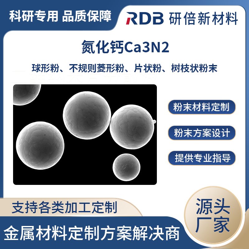 氮化钙(Ca₃N₂)粉末由上海研倍新材料通过高温直接氮化法、金属钙还原法等工艺制备而成,具备纯度高、粒径均匀、化学活性显著的特点。作为钙的氮化物,Ca₃N₂晶体呈现六方晶系结构,钙(Ca)与氮(N)原子间独特的化学键合赋予其特殊的物理化学性能。它具有一定的硬度和热稳定性,熔点 1195 ,在高温环境下结构相对稳定。Ca₃N₂化学性质活泼,遇水迅速水解生成氢氧化钙和氨气,这一特性使其在某些化学反应中具有独特的应用价值;同时,它在高温下能与多种金属、非金属发生反应,展现出良好的化学活性。此外,氮化钙在一些特定的电子和光学应用中,也展现出潜在的性能优势、/span>