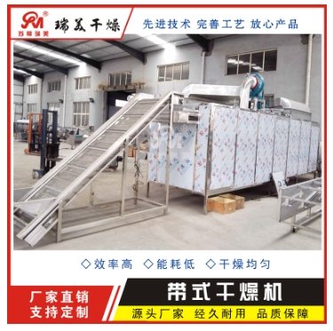 将所要处理的物料通过适当的加料机构,如星型布料器、摆动带、粉碎机或造粒机,分布在输送带上,输送带通过一个或几个加热单元组成的通道,每个加热单元均配有空气加热和循环系统,每一个通道有一个或几个排湿系统,在输送带通过时,热空气从上往下或从下往上通过输送带上的物料,从而使物料能均匀干燥、/p>