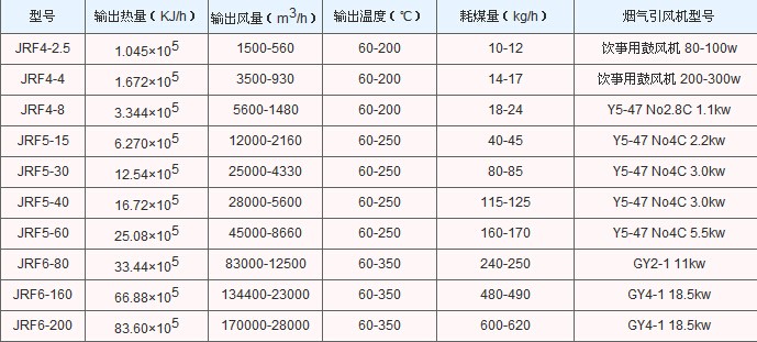 □环境基准温度标准按18℃?℃,煤的热值以5500kcal/kg计算、br style="box-sizing: border-box;"/>□表中热风温度是按输出风量确定的。热风炉JRF4型的热风温度可达?20?JRF5、JRF6型的热风温度可达300℃以上(特殊制造可?00℃以上),用户根据需进行调整、br style="box-sizing: border-box;"/>□热风炉烟窗配高度:JRF4?-5米,JRF5型 ?-8米、br style="box-sizing: border-box;"/>□表中外形尺寸对应位置见热风炉安装示意图、br style="box-sizing: border-box;"/>□炉膛下部几偶壁上的耐火层以炉篦处为起点,其高度:JRF4-4型为0.5米,可现场安装、br style="box-sizing: border-box;"/>□JRF6型为链条炉排式燃烧装置、/span>