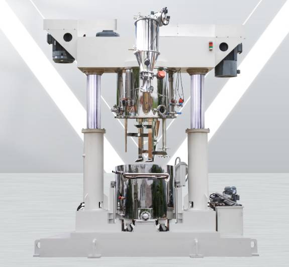 两组搅拌和高速分散,公转同时自转,使物料短时间受到强烈剪切、捏合作用,达到快速混合目的;