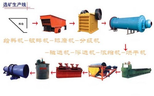 开采的矿石先由颚式破碎机进行初步破碎,在破碎至合理细度后经由提升机、振动给料机均匀送入球磨机,由球磨机对矿石进行粉碎、研磨。经过球磨机研磨的矿石细料进入下一道工序:分级。螺旋分级机借助固体颗粒的比重不同而在液体中沉淀的速度不同的原理,对矿石混合物进行洗净、分级。经过洗净和分级的矿物混合料在经过磁选机时,由于各种矿物的比磁化系数不同,经由磁力和机械力将混合料中的磁性物质分离开来。经过磁选机初步分离后的矿物颗粒在被送入浮选机,根据不同的矿物特性加入不同的药物,使得所要的矿物质与其他物质分离开。在所要的矿物质被分离出来后,因其含有大量水分,须经浓缩机的初步浓缩,再经烘干机烘干,即可得到干燥的矿物质、/p>