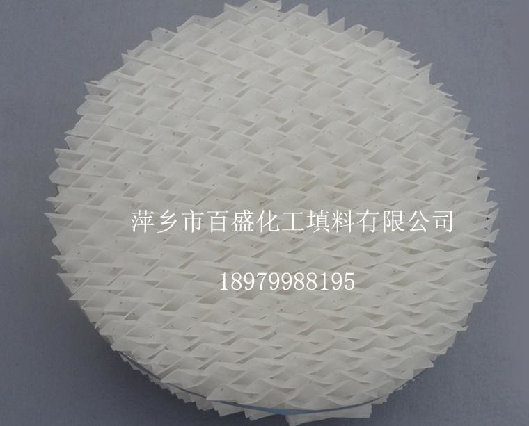 塑料丝网波纹填料性能:耐化学腐蚀性能好,其特殊的纤维结构对有机溶液和水溶液都有很好的润湿性。由塑料和塑料腈混纺纤维制成的丝网填料工作温度可?0 ,由聚酯网制成的丝网波纹填料工作温度可达150