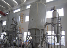 本机组工作过程为料液通过隔膜泵高压输入,喷出雾状液滴,然后同热空气并流下降,大部分粉粒由塔底排料口收集,废气及其微小粉末经旋风分离器分离,废气由抽风机排出,粉末由设在旋风分离器下端的授粉筒收集,风机出口还可装备二级除尘装置,回收率在96?8%以上、/p>
