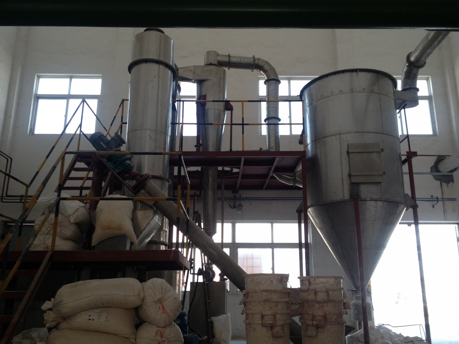 螺旋闪蒸干燥设备主要由加料器、干燥室、旋风分离器和布袋收集器组成。被干燥物料由加料器进入闪蒸干燥室内,热风沿切线方向进入闪蒸干燥室,并以高速旋转状态由闪蒸干燥室底向上流动,与物料充分接触,使物料处于稳定的平衡流化状态,在闪蒸干燥室内搅拌器的冲击和高速旋转气流的共同作用下,物料块被分散成不规则的颗粒状,较大未干的物料向室壁运动,由于其具有较大的沉降速度而落到闪蒸干燥室的下部重复上述过程。随着物料的分散和物料间的相互撞击,物料块表面已干的颗粒将移向闪蒸干燥室气体旋转轴心线,与气流一起排放到物料收集器,从而得到粒度及干燥程度都很均匀的干燥产品。此干燥机的突出优点是干燥效率高、能耗低、产品干燥均匀、结构紧凑、将粉碎与干燥熔于一体。适用于干燥粘稠状、膏状、粉状、滤饼状物料。在饲料工业中,可以用于干燥血粉、肉骨粉、鱼粉、蛋白质膏剂、糟粕等、br/>