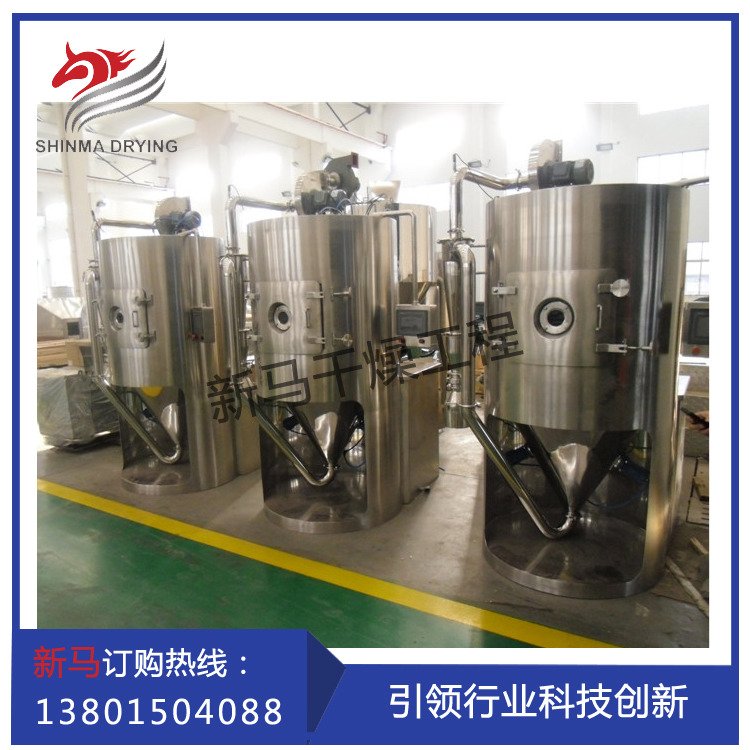 空气通过过滤器和加热装置后,进入干燥室顶部的热风分配器,通过热风分配器的热空气呈螺旋状均匀地进入干燥室,同时由泵浆料液送到装在干燥室顶部的离心喷雾头,料液被喷成极小的雾状液滴,使料液和热空气接触的比表面积大大增加。小液滴和热风并流下沉,水份迅速蒸发在极短的时间内被干燥为颗粒制品,在塔底和旋风分离器中捕集,废气排发至外界、/p>