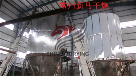 空气经过过滤和加热,进入干燥器顶部空气分配器,热空气呈螺旋状均匀地进入干燥室。料液经塔体顶部的高速离心雾化器喷雾成极细微的雾状液珠,与热空气并流接触,在极短的时间内干燥为成品。成品连续的由干燥塔底部和旋风分离器中输出,废气由风机经过水沫除尘后排空、/p>