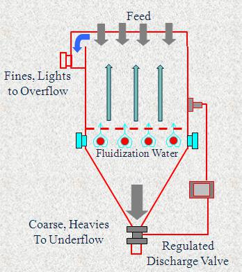 粗煤?/span>分选机(TBS)是一种基于粒度和密度分选细粒物料的高效水力分级设备+/span>它采用受碍床浓缩方法对物料进行分选。TBS工作旵/span>利用上升水流在槽体内产生皃/span>紊流对物料进衋/span>干扰沉降分选,根据物料比重的不同来分选物料。矿浆由分/span>纾/span>入料系统进入对流干扰沉降(TBS)分选机主机槼/span>佒/span>内,同时按预定的压力和流速由泵将水打入其底部的分配器,通过紊流板均匀分布到干扰床分选机底部,形成向上的扰动水流。下降的物料与上升水流相遇而形成干扰床层。当达到稳定状态时,入料中的那些密度低于干扰床层平均密度的颗粒将浮起,进入溢流。而那些比干扰床层平均密度大的颗粒将穿透床层进入沉物流,并通过底部的排料口排出。粒度和密度分选点主要取决于给水的体积流量和干扰床层高度,由控制系统对分选机的给水量和床层高度进行控制。排料阀门由自动电控系统控制,包括压力表,单回路PID控制器,气动/电动控制阀、/span>
