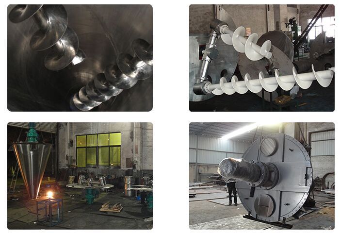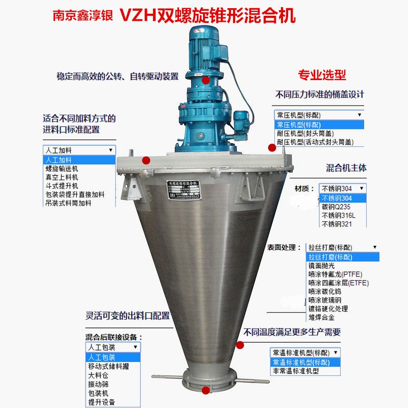 VZH双螺旋锥形混合机(双螺旋混合机)与其他混合机相比较具有装机功率低,对混合物料适应性广不破坏混合物料等优点。对热敏性物料不会产生过热,对颗粒物料不会压馈和磨碎,对比重悬殊和粒度不同的物料混合不会产生分层离析现象,对粗料、细料和超细粒(纳米级)的混合也有良好的适应性。VZH双螺旋锥形混合机(双螺旋混合机)在不破坏混合物的状态下,在锥体内产生提升、对流、剪切、扩散等复合运动,能够柔和地混合物料从而达到极佳混合的效果 冷却加热夹套 可在混合机筒体外增加夹套,通过向夹套内注入冷热介质来实现对物料的冷却或加热;冷却一般泵入工业用水,加热可通入蒸汽或电加热导热油 加液混合: 在混合机中间轴位置通入喷液管,连接雾化喷嘴,可实现加液混合;通过选择特定材质,可以加入酸、碱性等液料进行粉液混合 负压\\\\真空进料 在特定的工艺中可将混合机筒体做成负压仓,使用软管将流动性好的干燥物料吸进混合仓 行混合,可避免物料加料环节中的残留和污染 出料阀: 标准型设备一般配备梅花阀(错位阀),此阀与长螺旋底部贴合紧密,有效减少混合死角,驱动形式有手动、气动、电动可选;根据需要,也可加装蝶阀、球阀、星形卸料阀、翻板阀 刀型闸阀边出料阀等、br />