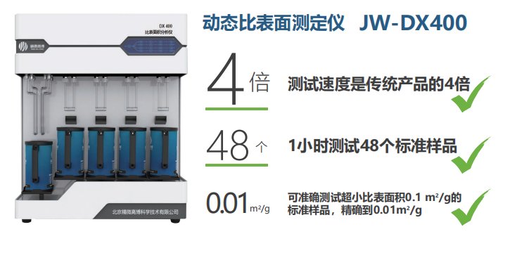 适用于质量控制部门来料检测的动态仪器,兼备准确度与高效率、/span>JW-DX系列动态比表面测定?/strong>采用专利号为20140320453.2的吸附法专利测试,完全避免了常温下样品脱附不完全带来的测试误差,非常适合粉体、颗粒材料的在线快速测定。比表面测试范围?gt;0.0001m2/g、/span>