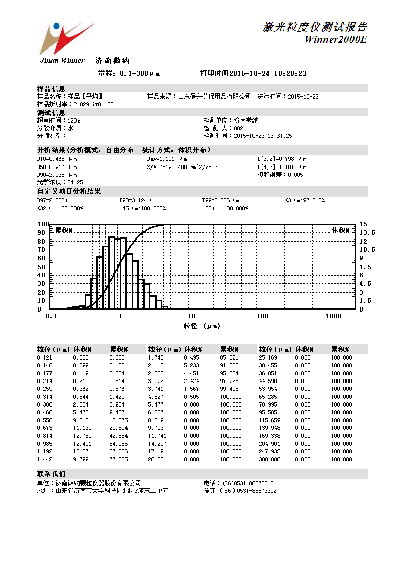 由于颗粒的粒度与形状对其产品的性质与用途影响很大,不同的测量方法适用于不同的粒度范围,由于采用了不同的原理,对于同一样品的检测结果在数据上会有偏差,目前工厂常用的分析方法已经普遍使用激光粒度仪进行检测。以下是使用winner2000E检测的钛白粉粒度,测试报告如下9/span>