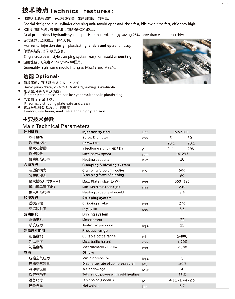 产品简介:**双缸锁模结构,开合模速度快,生产周期短,效率高。双比例油路系统,控制精准,节约能?5%以上。卧式注射,塑化稳定,操作方便。单横梁结构,拆卸模具方便