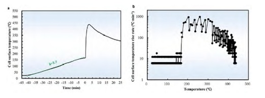 ? (a)电池温度随时间变化图;(b)电池升温速率与温度的变化国/p>