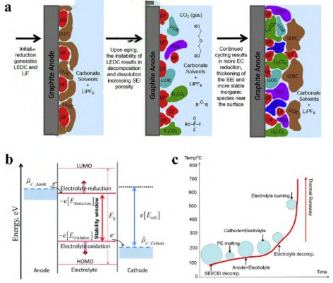 ? (a)在石墨负极上形成SEI膜的示意图;(b)正负极SEI膜的形成热力学;