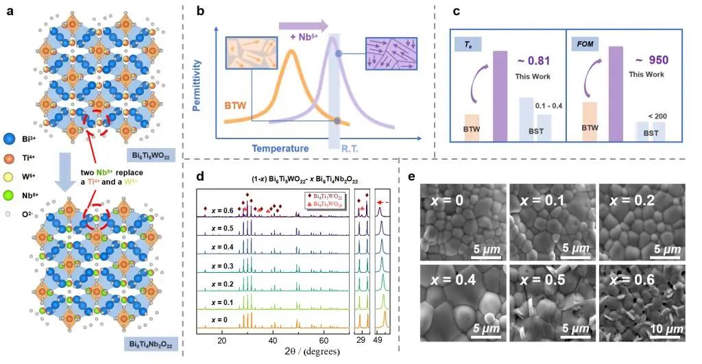 针对这一难题+strong>西安交通大学电信学部电子科学与工程学院周迪教授团队在此前探索的新型高介低损Bi6Ti5WO22陶瓷体系的基础之上,通过引入Nb5+离子取代Ti4+/W6+离子,设计并顺利制备出组分为(1-x)Bi6Ti5WO22-xBi6Ti4Nb2O22的一系列固溶体陶瓷。这一明智的离子取代设计,实现了对该体系陶瓷晶格常数与纳米畴尺寸的连续精准调控,成功将陶瓷材料的相变温度点移至室温附近,使得材料的介电可调性能获得了大幅提升。其中,组分?.7Bi6Ti5WO22-0.3Bi6Ti4Nb2O22的陶瓷在极低电场?.5kV/mm)下兼具超大的介电可调度(~75.6%)与超低损耗(?.002),这一可调度是钛酸锶钡陶瓷的两倍,而损耗仅为其十分之一。中子粉末衍射和高分辨率透射电子显微镜显示了取代引发的纳米畴和微应变的变化,密度泛函理论模拟计算揭示了离子取代对极化的贡献、span style="color: rgb(0, 0, 0);">该研究为制备快速响应的高性能铁电移相器提供了一种理想的替代品,也为调节相变温度以改善介电性能提供了一个通用策略、/p>