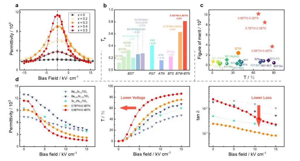 研究结果以“在低损耗铁电陶瓷中通过离子取代设计实现超大介电可调度?Giant dielectric tunability in ferroelectric ceramics with ultralow loss by ion substitution design)为题,在国际知名期刊《自然通讯?Nature Communications)在线发表。该工作以西安交通大学为唯一通讯单位,电信学部电子学院博士生李睿韬为论文第一作者,电子学院周迪教授、徐谛明助理教授、微电子学院王大威教授和航天学院梁旭教授为共同通讯作者。该研究工作得到国家自然科学基金、陕西省国际合作项目等项目的资助。西安交大国际电介质研究中心、合肥国家同步辐射实验室、澳大利亚核科学技术组织提供了相关测试表征支持、/p>