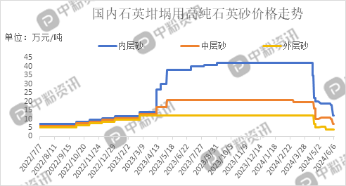 中国粉体网讯6?8日,硅业分会发布国内高纯石英砂、石英坩埚价格信息,其中高纯石英砂均价较上周下降0.5-1万元/吨左右,石英坩埚均价较上周下?.05-0.1万元/只左右、br/>