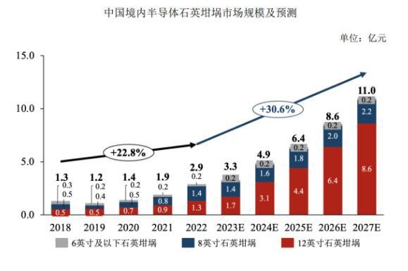在半导体石英坩埚领域,国外半导体产业逐渐转移至国内,随着新能源车、智能电网、自动驾驶、人工智能的发展? 英寸 12 英寸半导体硅片出货量持续增长,我国半导体硅片供应商开始加码大硅片产能布局,对半导体石英坩埚的需求持续增加,预计 2027 年,全球半导体石英坩埚市场规模将扩大 29.5 亿人民币,期间年复合增长率为 10.1%。目前,国内个别企业开展了 32 英寸半导体级石英坩埚的研发工作并具备量产能力、/p>