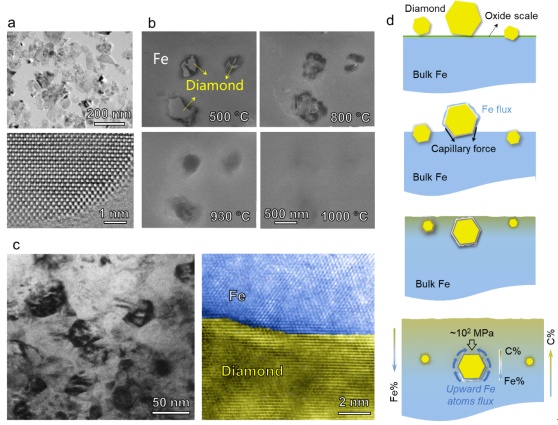 为验证这一大胆设想,研究团队以金刚石纳米颗粒和高纯铁及低碳钢为对象,利用原位透射电子显微镜对加热过程中金刚石纳米颗粒的运动过程进行实时观察、/p>