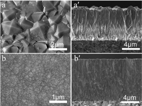 (a,a?)微米金刚石涂层;(b,b?)纳米金刚石涂层的表面和截面形貋/p>