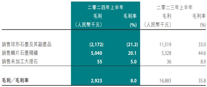 球形石墨及其副产品的毛损及毛损率?024年上半年约为人民?/span>2.2百万元及21.2%,?023年上半年的毛利及毛利率则约为人民?/span>11.5百万元及33.0%、/span>由毛利及毛利率转为毛损及毛损率主要是由于2024年上半年石墨市场竞争激烈,导致球形石墨及其副产品价格及销量下降,以及2024年上半年因存货可变现净值下降而确认存货拨备约人民?.1百万元所致、/span>