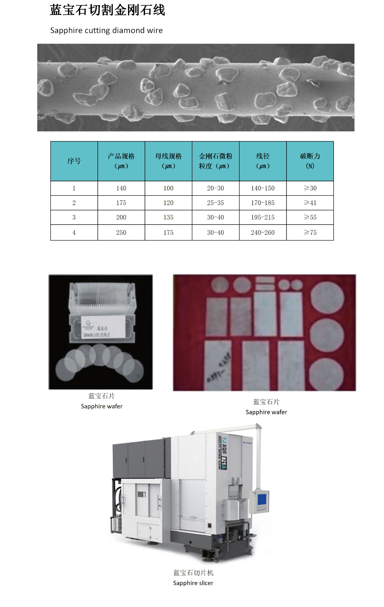 蓝宝石切剱/span>:蓝宝石具有硬度高、耐磨性好、透光性强等优良特性,在光学领域应用广泛,如用于制造光学镜片、手表表镜等。金刚石线能够有效地对蓝宝石进行切割,满足其在光学领域的高精度加工需求,保证切割面的平整度和光洁度,从而提高光学元件的性能、/span>