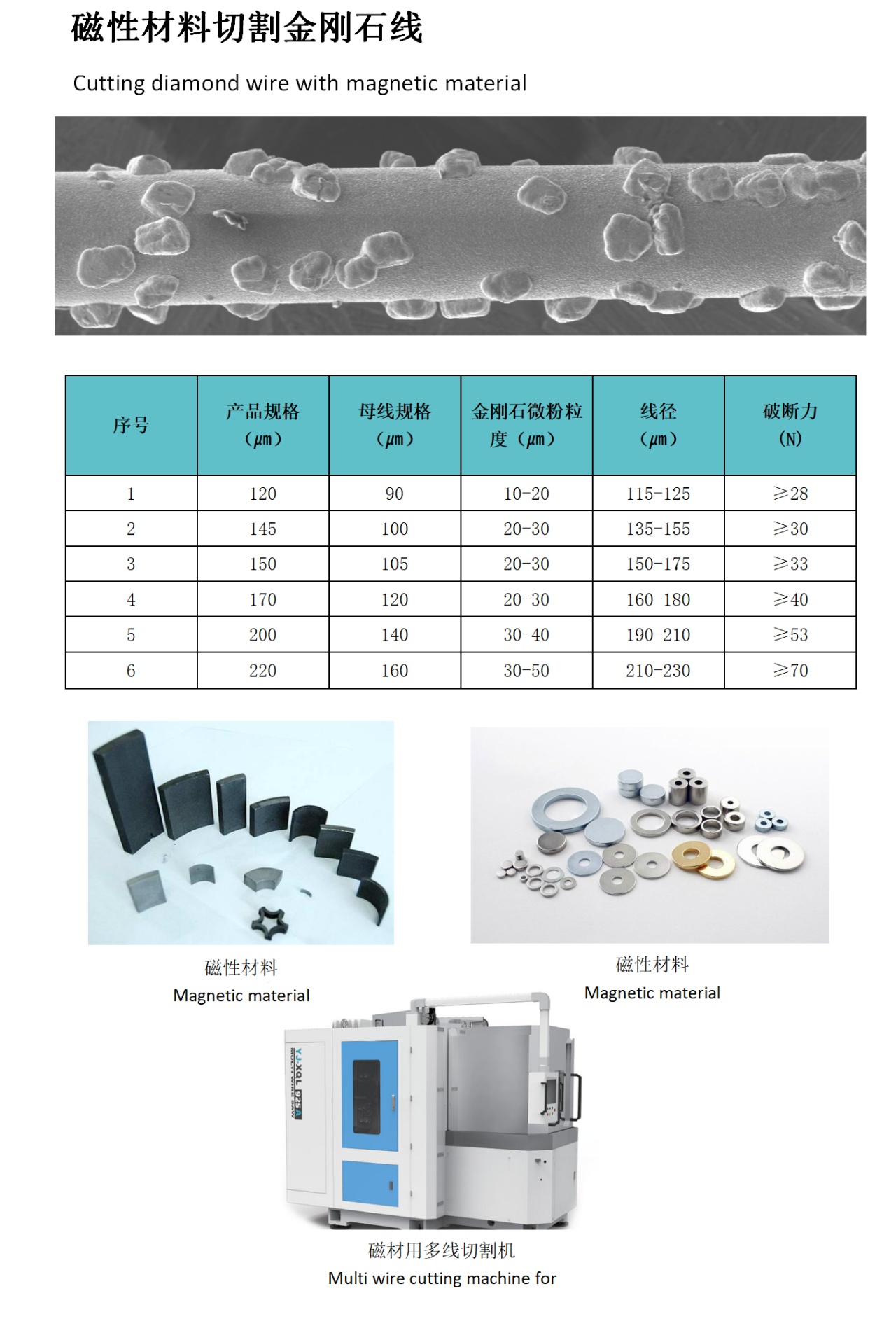 磁性材料切剱/span>9/span>磁性材料中的钕铁硼具有高磁能积、高矫顽力等优点,在电子、电气、汽车等领域应用广泛。金刚石线可用于切割钕铁硼等磁性材料,使其能够加工成各种形状和尺寸的磁体、/span>