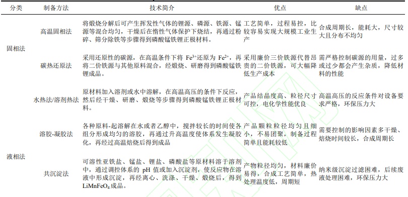 磷酸锰铁锂制备可在磷酸铁锂的工艺路径上延续,包括固相法与液相法。其中,固相法包括高温固相法、碳热还原法等,液相法包括水?溶剂热法、溶胶凝胶法、共沉淀法等。固相法简单,适合工业化生产;液相法更复杂,但产品性能更好、/p>